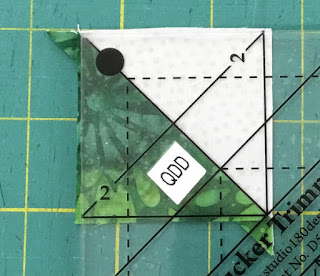Start by marking the back of your white squares with stitching lines using your Quilter's Magic Wand to get the 1/4" on each side of the center diagonal.