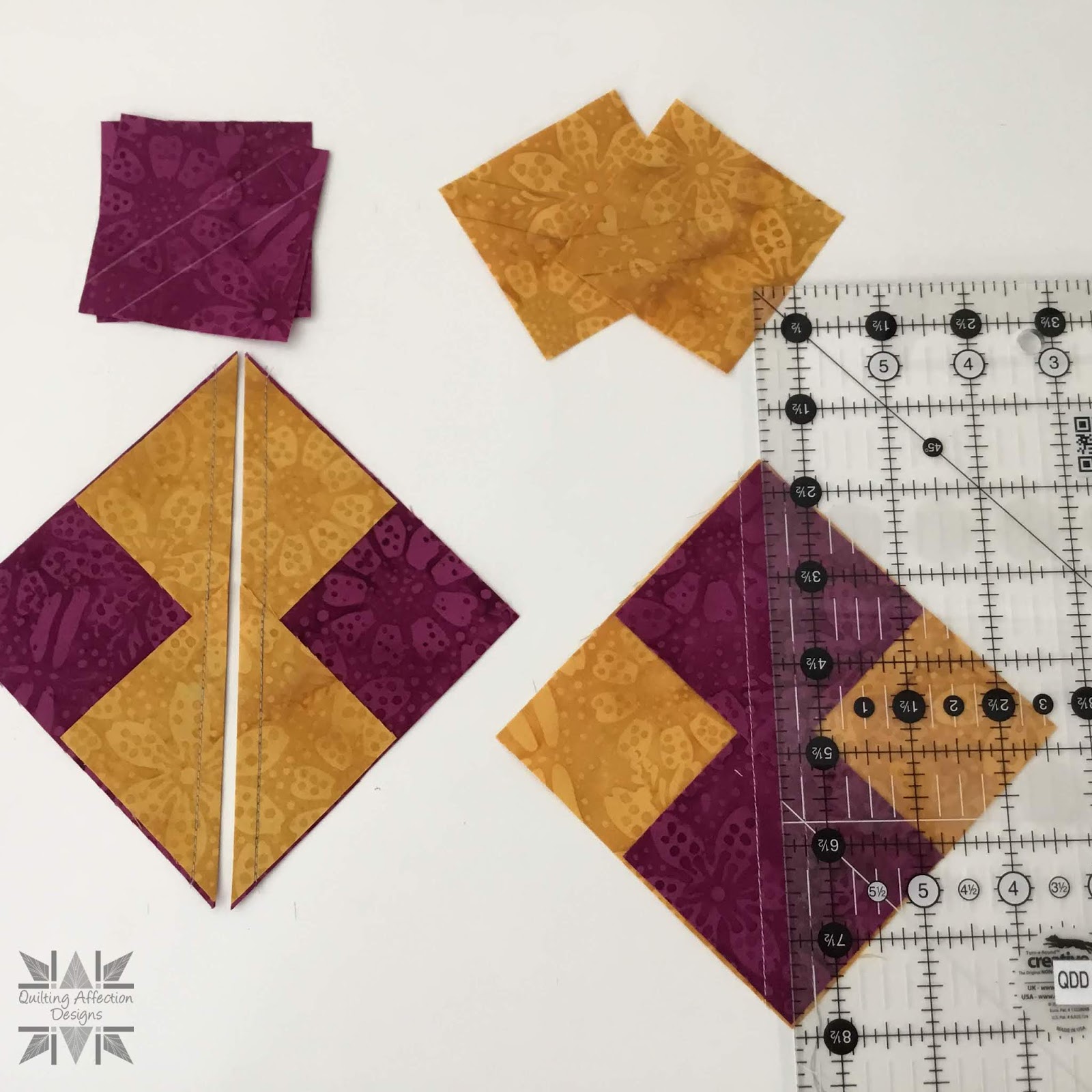 7. Stitch on the drawn lines, and cut down the middle. Pressing according to your block instructions.