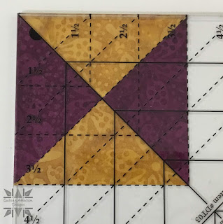 6. Using your Quilter's Magic Wand Mark two more stitching lines on the back of the one the half square triangles. Stitch and Cut down the middle as we did before with the Half Square Triangles.